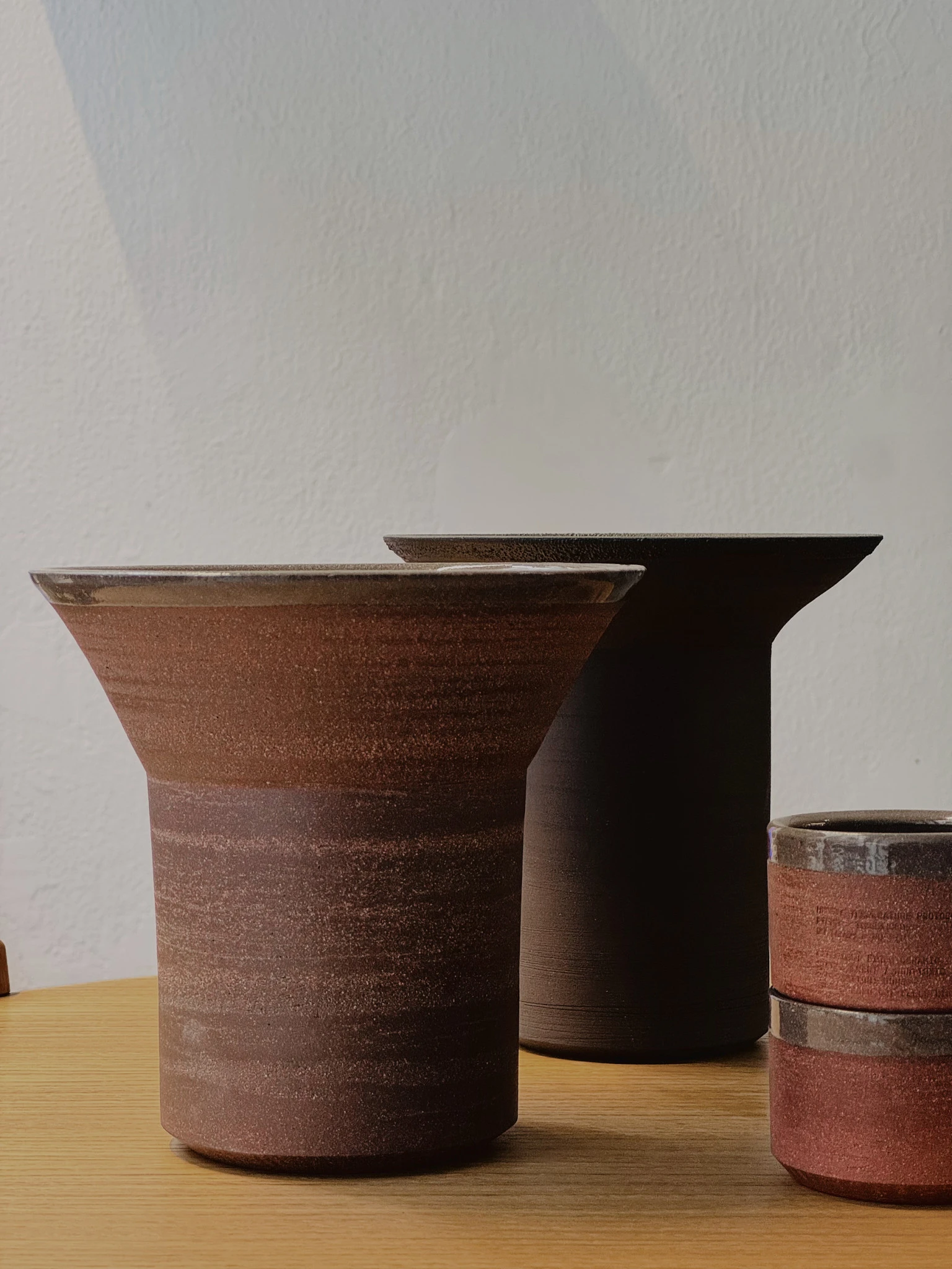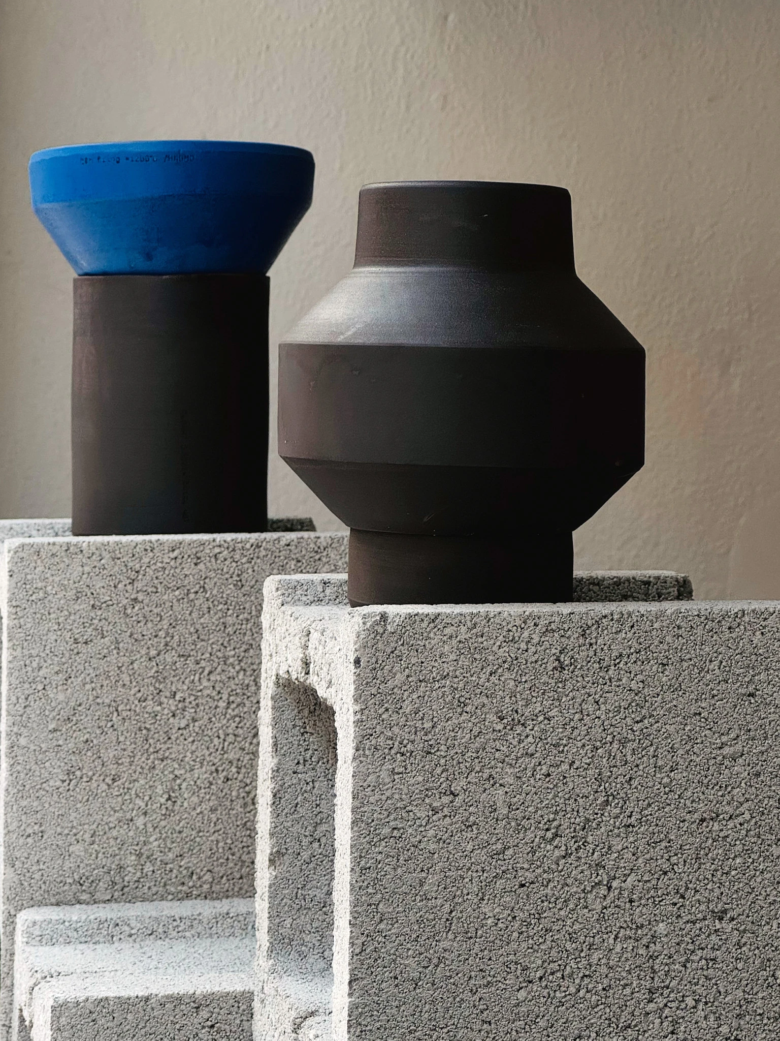 Κεντρική θέση στην έκθεση έχει μια σειρά από αρθρωτά βάζα - συστήματα που αποτελούνται από βάσεις, προεκτάσεις και εναλλάξιμες κωνικές φόρμες, με δυνατότητα πολλαπλών συνδυασμών. Η σειρά παρουσιάζεται όχι ως ολοκληρωμένο σύστημα, αλλά ως σχεδιαστική πρόταση σε εξέλιξη, όπου κάθε σύνολο αναδεικνύει τόσο τις δυνατότητες όσο και τις δυσκολίες της διαστασιολογικής ακριβείας στη χειροποίητη κεραμική.